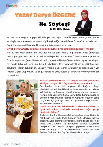 Bu sayımızda dergimizin yayın ekibinde yer alan, aynı zamanda çocuk kitabı yazarı olan ve