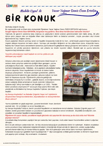 Bu sayımızda sıcak ve ilham dolu söyleşisiyle Öğretmen Yazar Yağmur Deniz ÖZER ERTEKİN’i ağırlıyoruz.