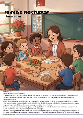 Pazartesi günü sınıfa bir mektup geldi. Hepimiz şaşakaldık. Bir iğde dalı vardı içinde bir de yemişleri. Okuduk mektubu